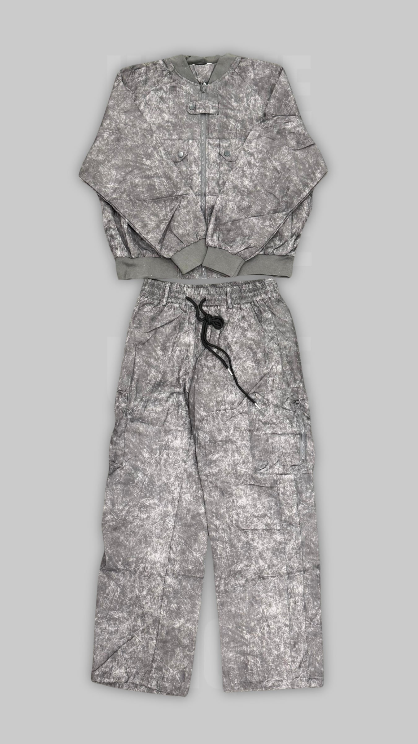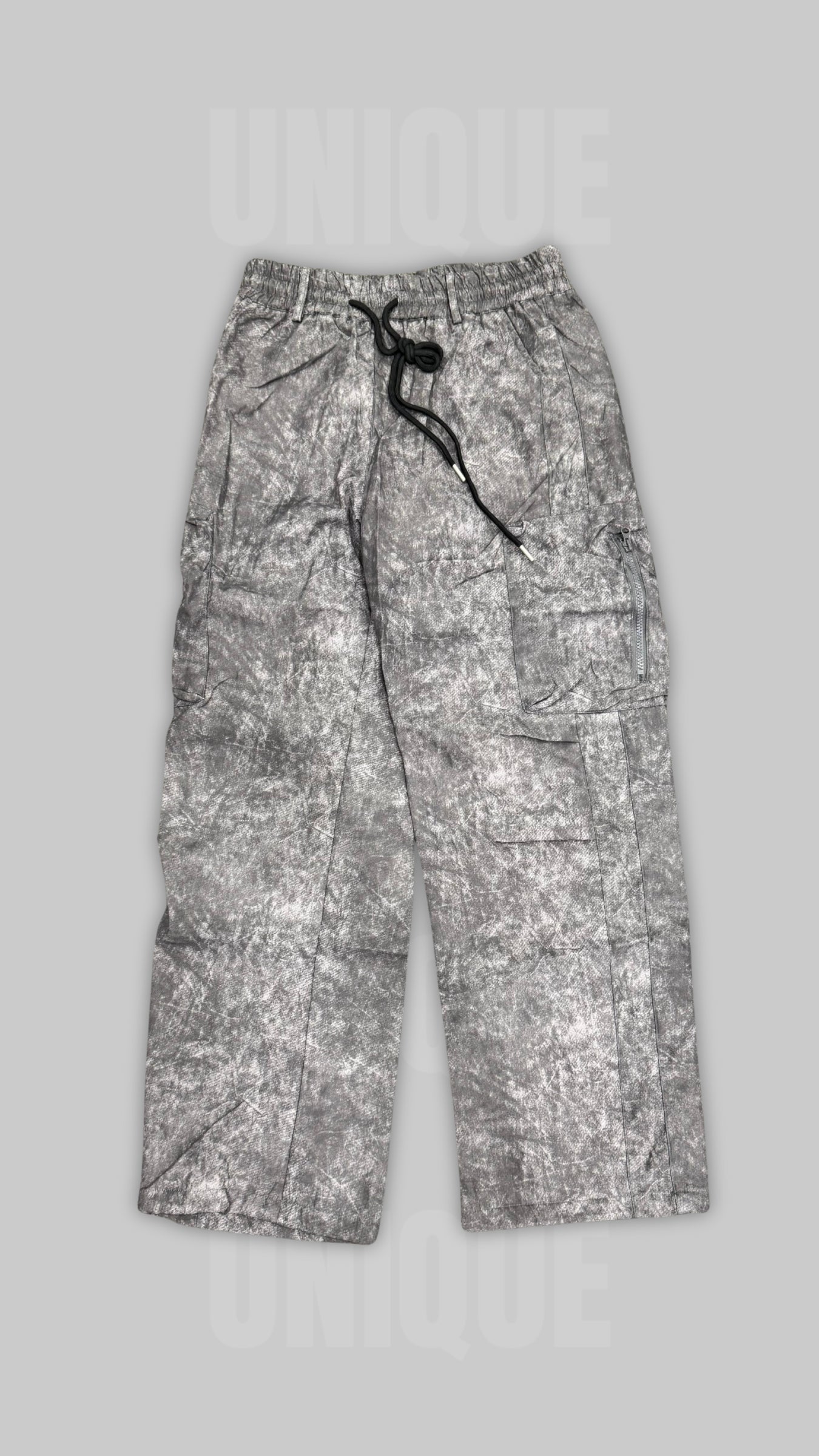 Un completo sportivo e versatile che unisce la funzionalità di un cargo con un'estetica moderna e di tendenza. Il tessuto, con la sua particolare fantasia "marmo" o "nuvola", lo rende un capo unico e originale.