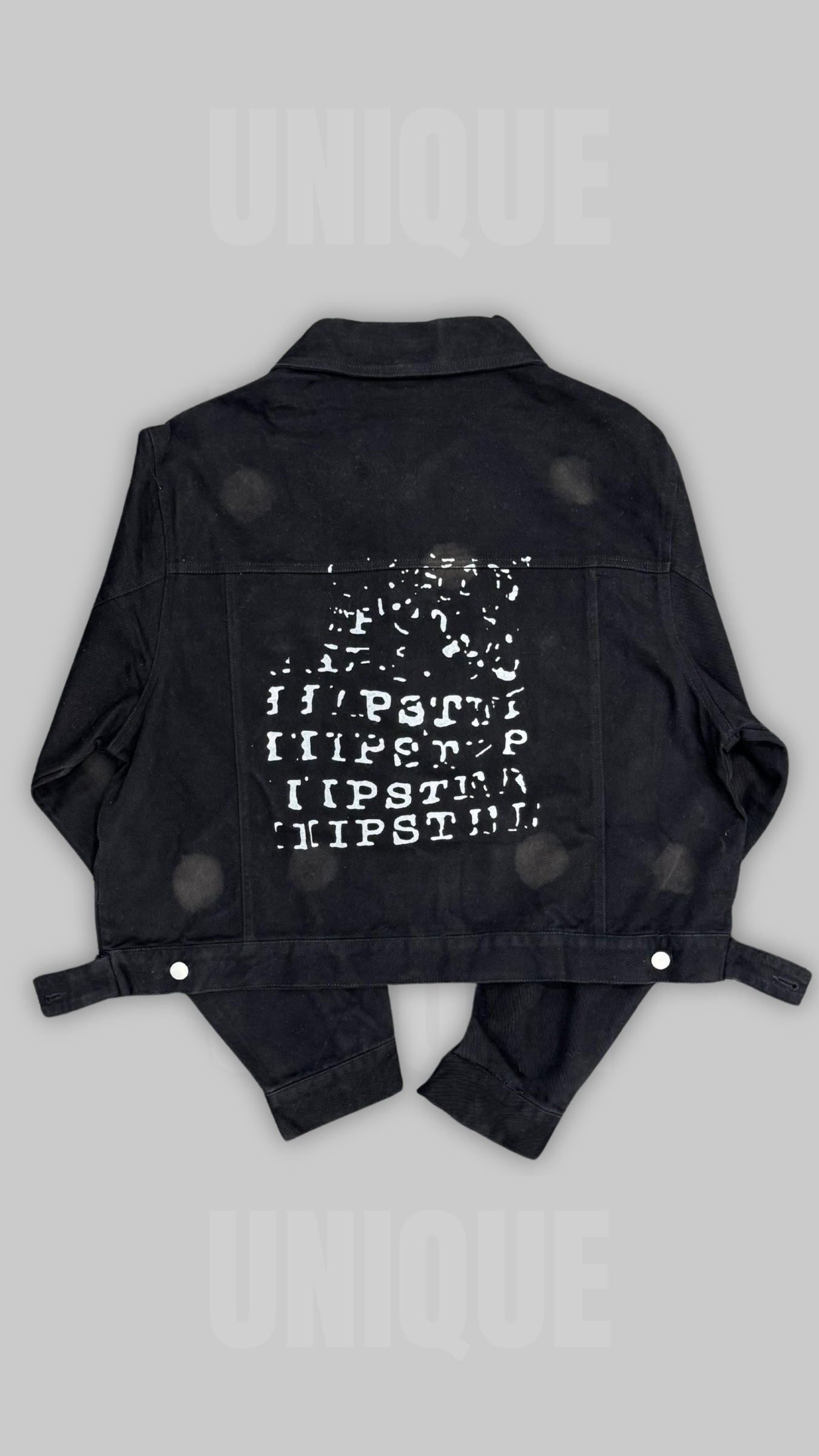 Un completo audace che unisce giacca e pantaloni in denim nero con un tocco di ribellione. Il look distressed e gli schizzi di colore bianco irregolari creano un'estetica unica e graffiante.