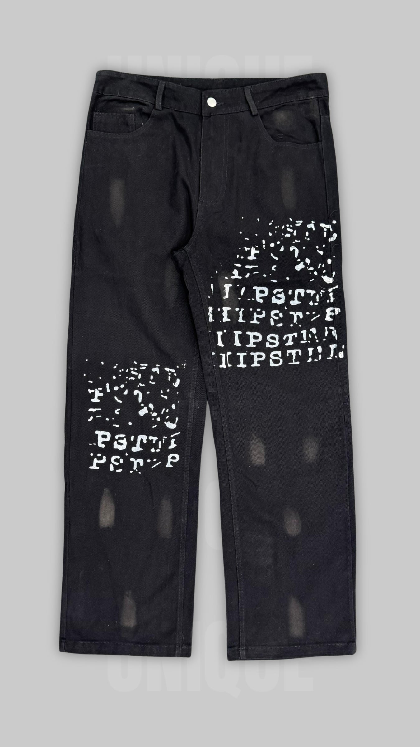 I pantaloni a gamba larga riprendono il motivo della giacca con scritte e schizzi di pittura, creando un look coordinato e di grande impatto. La vestibilità comoda e rilassata li rende perfetti per un outfit da giorno o da sera.
