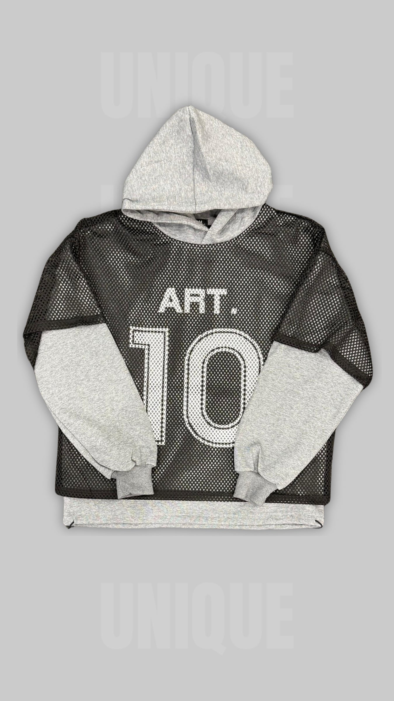 Aggiungi un tocco sportivo e street style al tuo guardaroba con questa felpa unica, che unisce design e comfort. Il corpo in mesh nero con il numero "10" in evidenza, richiamando un look sportivo e contemporaneo, si combina con le maniche grigie in tessuto felpato per un contrasto perfetto. Il cappuccio aggiunge funzionalità e stile per completare il look casual e moderno.