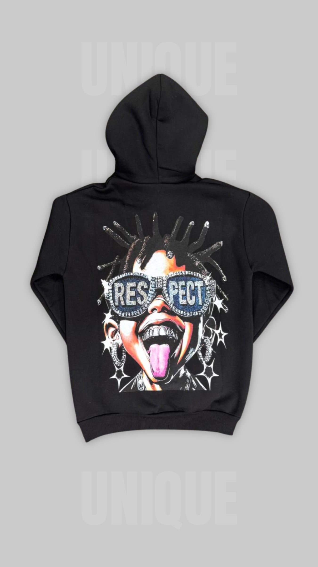 il focus è sugli occhiali da sole bling-bling tempestati di strass, che riportano in modo evidente la parola "respect". questa felpa oversize è l'emblema dello streetwear giocoso e irriverente, combinando il comfort del cotone felpato con una grafica che non passa inosservata.