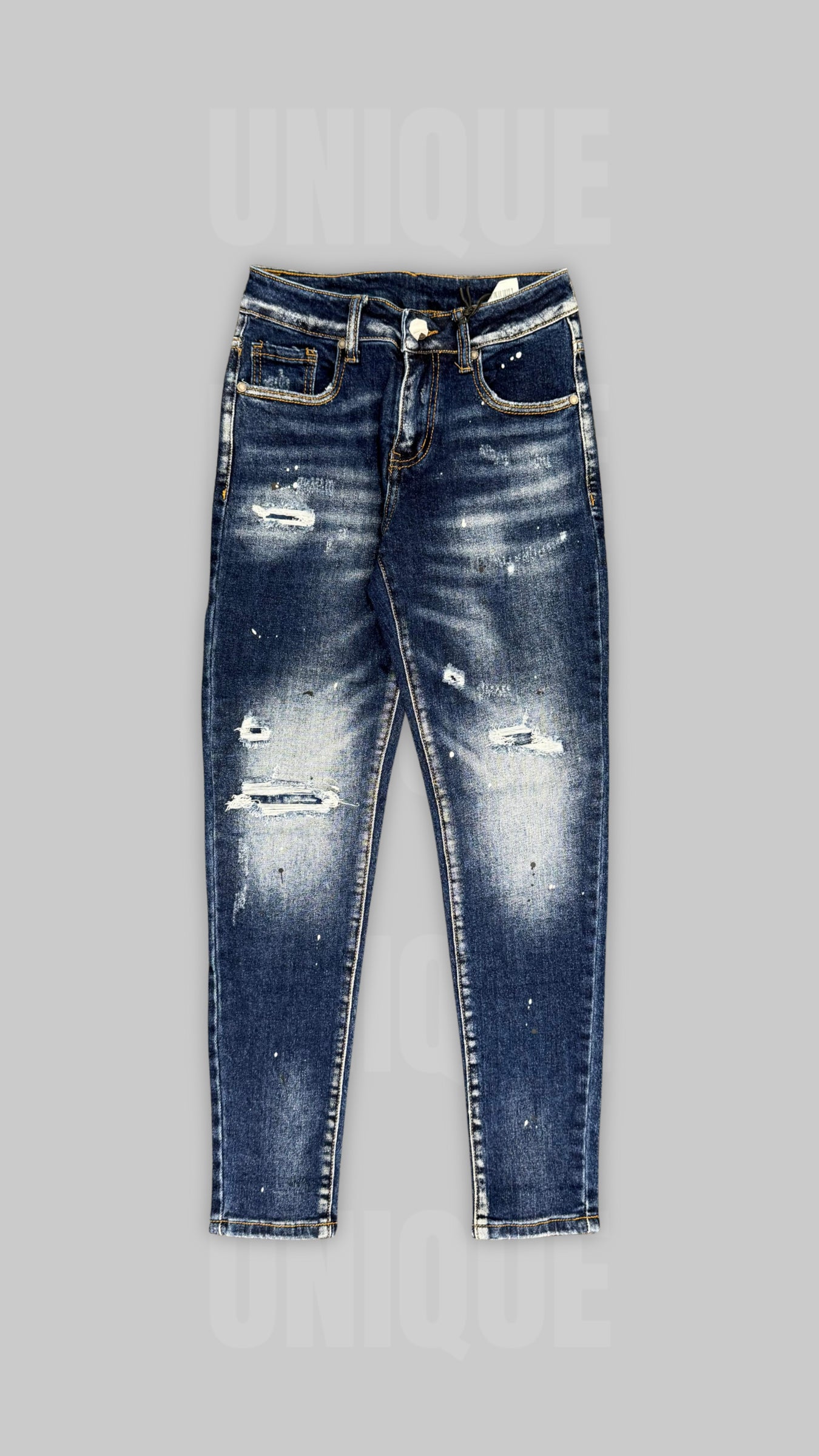 Un jeans che unisce lo stile classico del denim con un tocco di creatività urbana. Il lavaggio blu scuro, con le sue sfumature naturali, è arricchito da dettagli distressed e da schizzi di vernice bianca, che simulano un effetto "graffiti" e donano un tocco di unicità al capo.