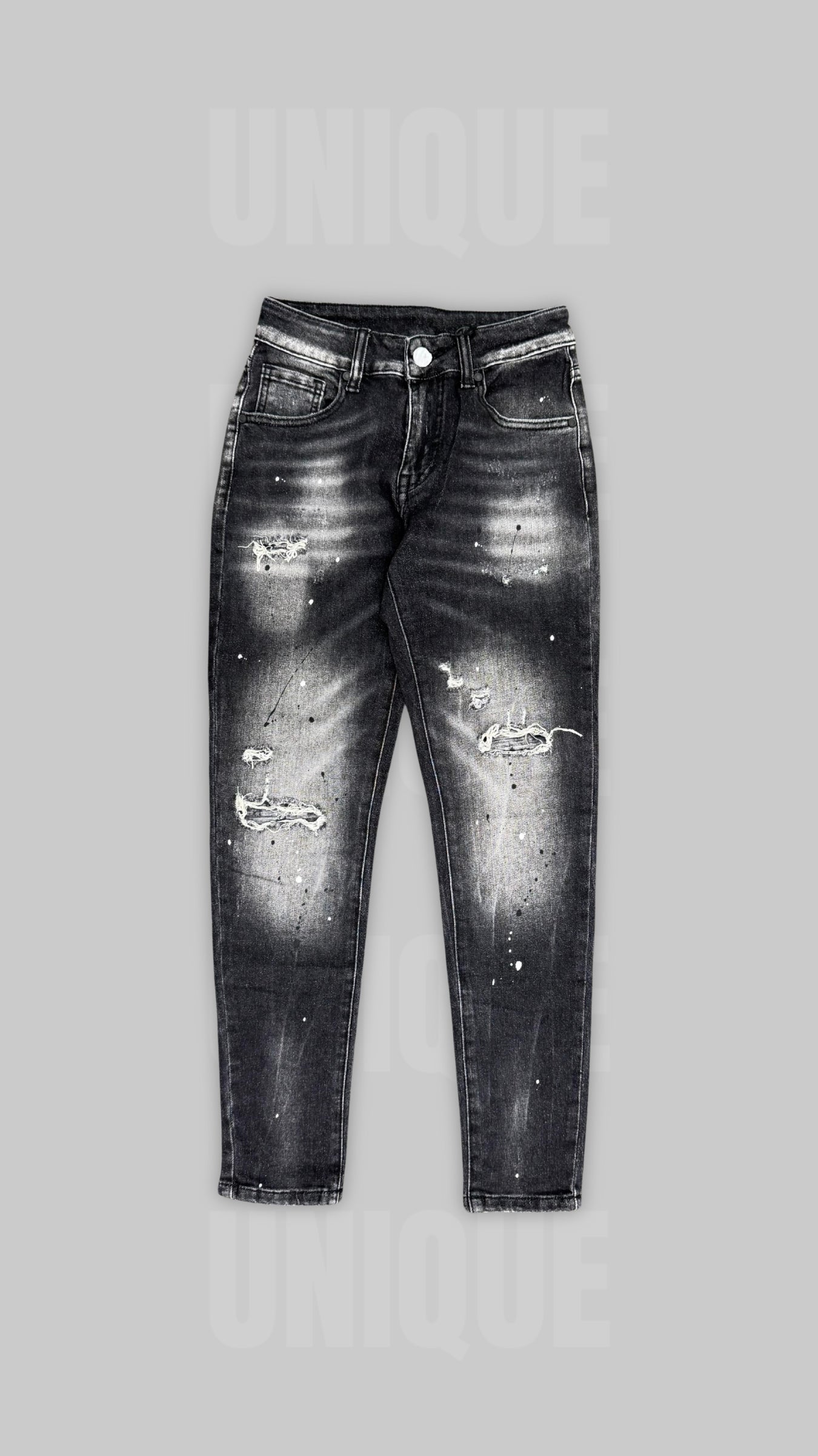 Il lavaggio nero, dall'effetto sfumato, è arricchito da dettagli distressed e da schizzi di vernice bianca, che conferiscono un look unico e grintoso. Gli strappi sulle gambe, strategicamente posizionati, aggiungono un tocco di carattere inconfondibile.