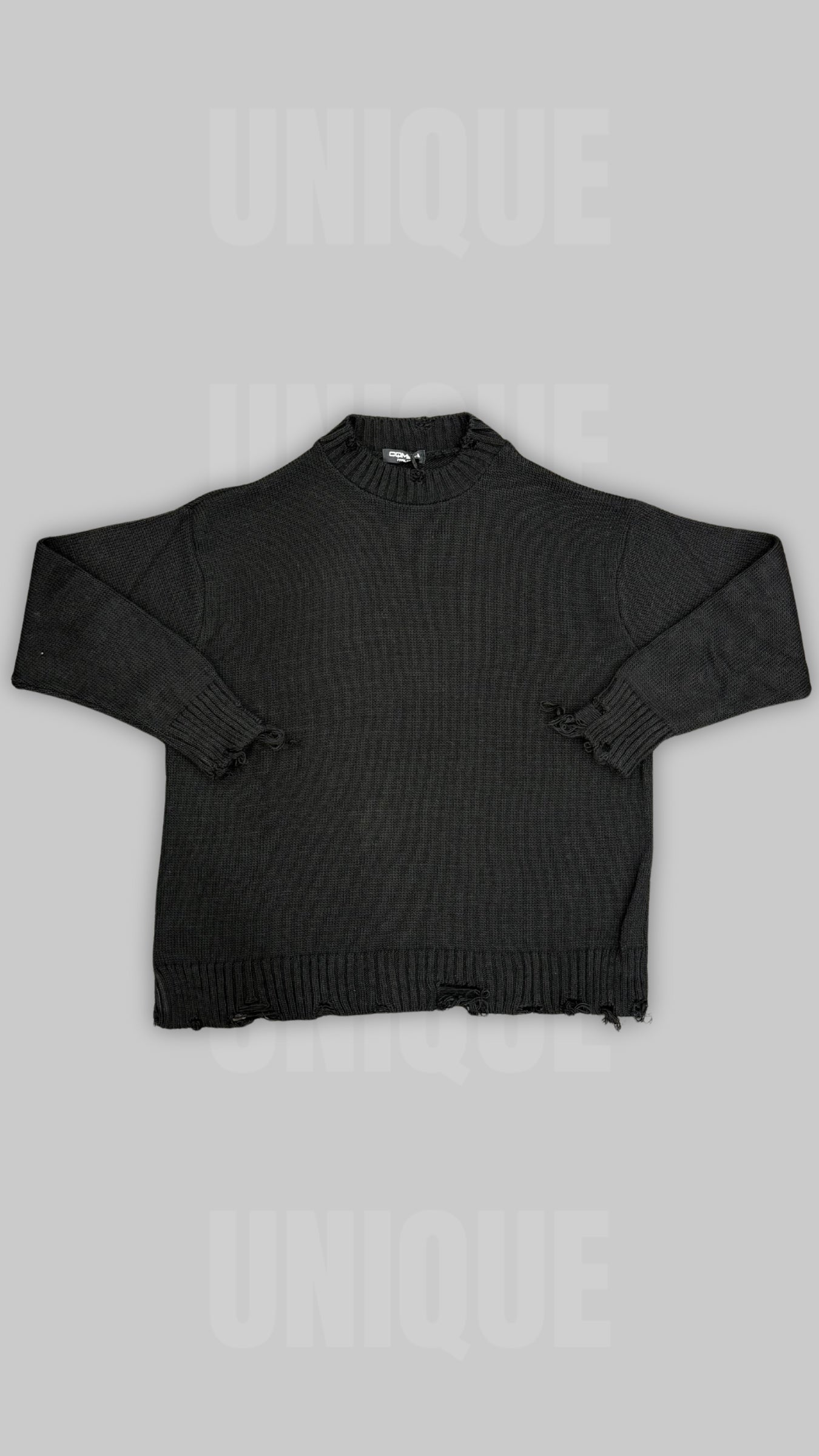 Distinguiti con carattere. Questo maglione girocollo presenta un design essenziale arricchito da dettagli effetto "destroyed" sul fondo e sui polsini, per un look vissuto e urban dal forte impatto visivo. Perfetto per chi ama la moda con un tocco grunge, ma non vuole rinunciare alla vestibilità confortevole e alla qualità del tessuto.
