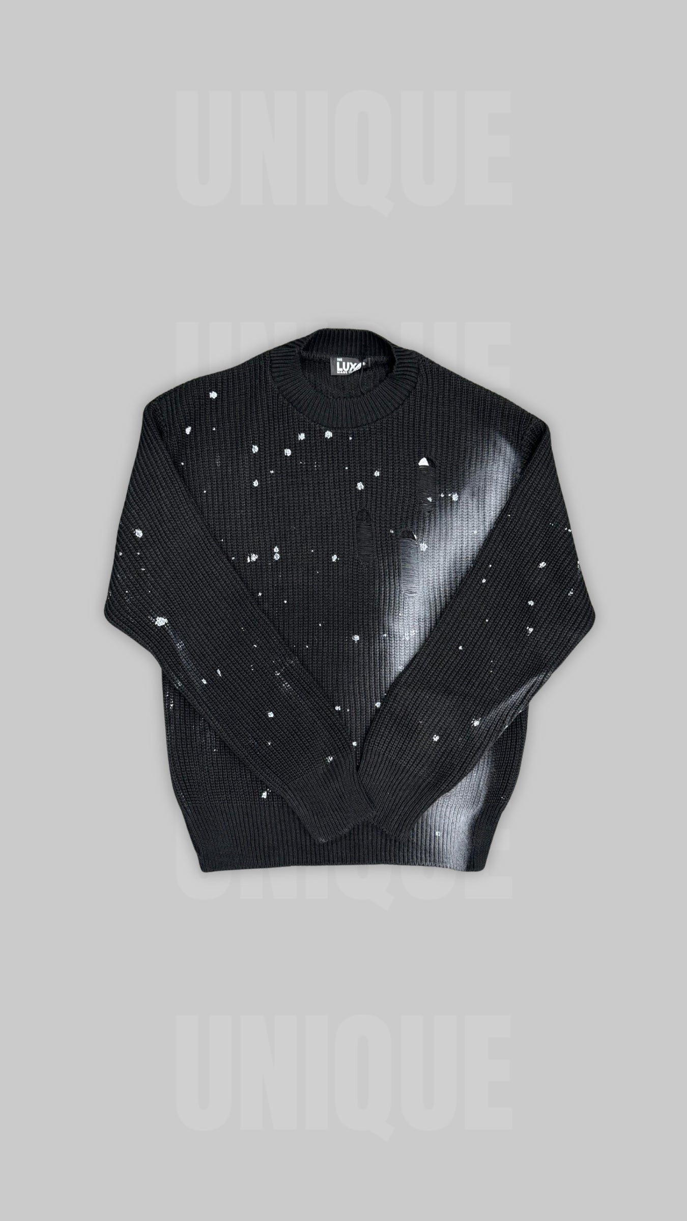 I dettagli strappati e gli schizzi di vernice bianca, che ricordano una via lattea o un cielo stellato, lo rendono un capo iconico. La sfumatura bianca sulla parte superiore e sulle maniche aggiunge profondità, creando un look misterioso e accattivante.