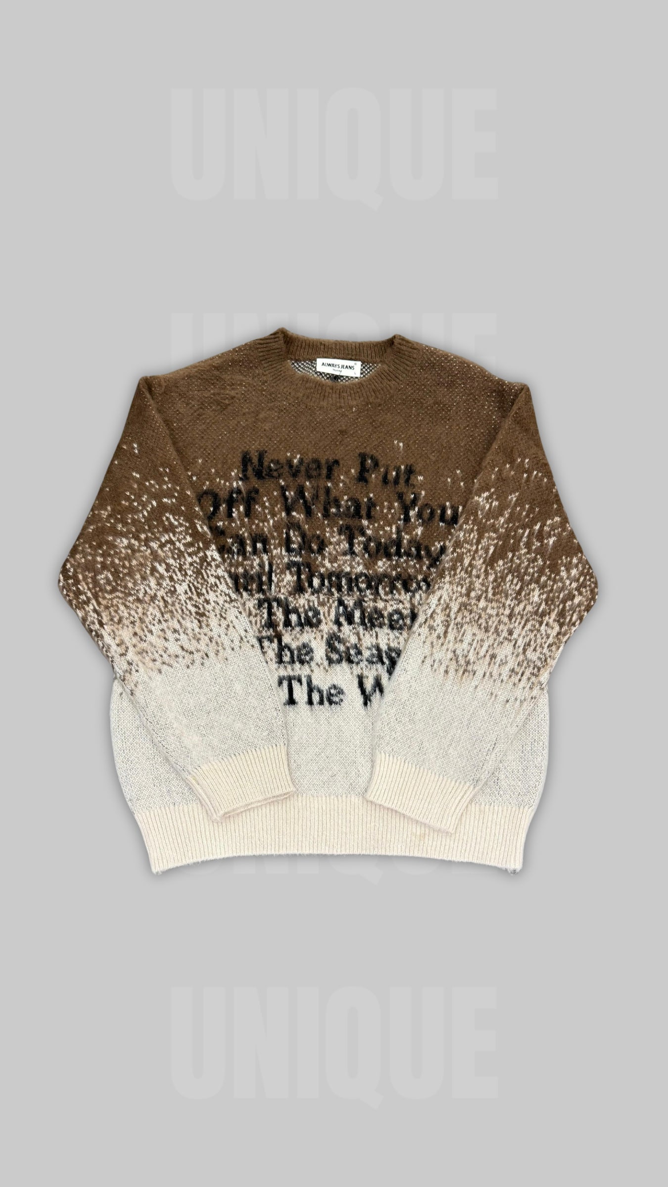 Un capo che parla da sé. Il maglione "Never Put Off What You Can Do Today" non è solo un capo d'abbigliamento, ma una dichiarazione. La stampa in grassetto su un'elegante base a effetto sfumato lo rende un pezzo unico. Indossalo per un look casual, ma con un tocco di personalità che non passa inosservato. Abbinalo a un paio di jeans scuri per un outfit audace e moderno.